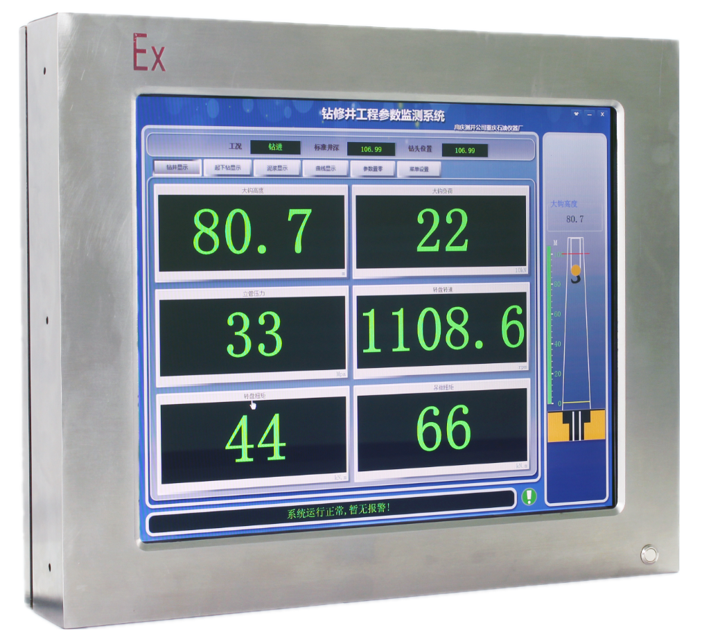 防爆触摸一体机是用于易爆场所的专用计算机,在石油、炼油厂等具有爆炸性气体的危险场所使用,与温度、压力、湿度等其他外部设备组合一起,作为钻井、采油等各类井场控制设备。还可用于工业通讯、数据采集及控制、数据库存储查询等,也可作为计算机管理系统。机身采用全不锈钢拉丝,轻量化设计,既符合防爆标准,又美观漂亮。通过平台放置、壁装、吊装方式安装,广泛运用在煤矿、石油、化工等行业。